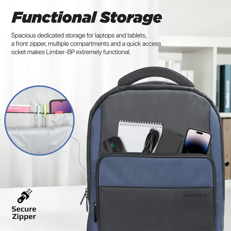 Limber-BP Black Promate Lightweight Comfortable 15.6” Laptop Backpack with Secure Zippers, Water-Resistance, Multiple Compartments and Padded Straps