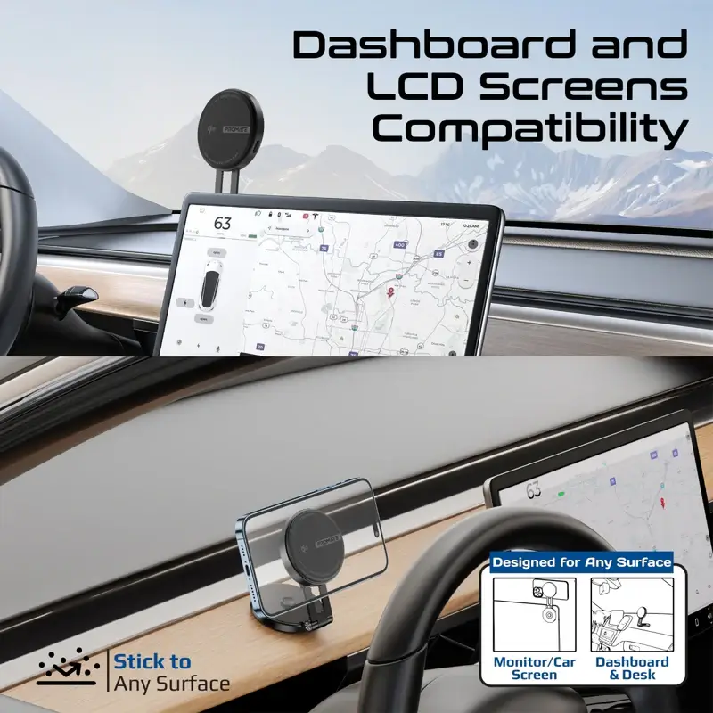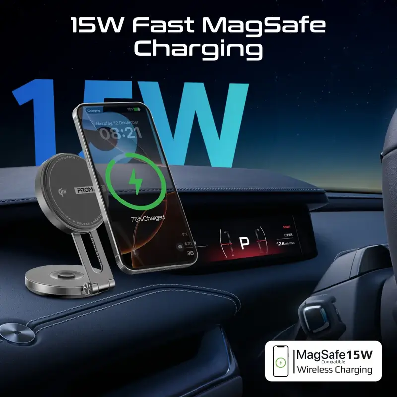 MagMate-1 Promate Qi2 Certified Wireless Magnetic Car Charger Mount with 15W MagSafe Compatibility, Car Dashboard & LCD Screen Support, Adjustable Rotatable Swing Arm, Cradleless 360° Design, FOD