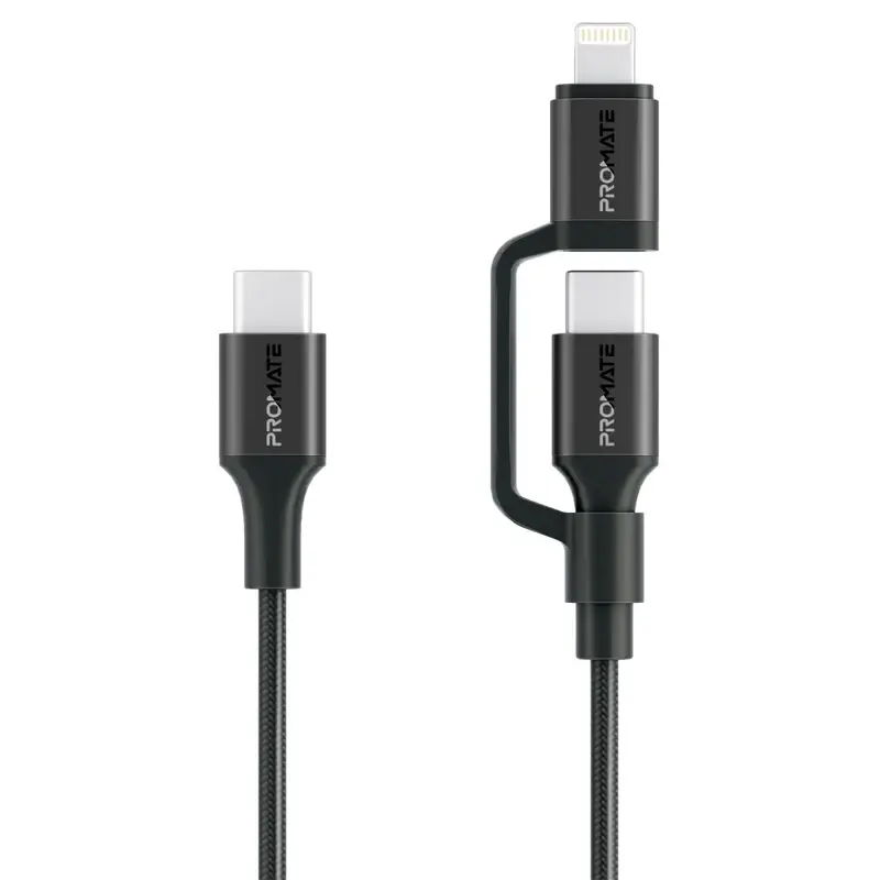 PowerLink CCi Promate 3-in-1 MFI Certified Lightning and USB-C™ Cable with Interchangeable Connectors, 60W USB-C™ Output, 27W Lightning Output, Sync & Charge, Tangle-Free Nylon Braided