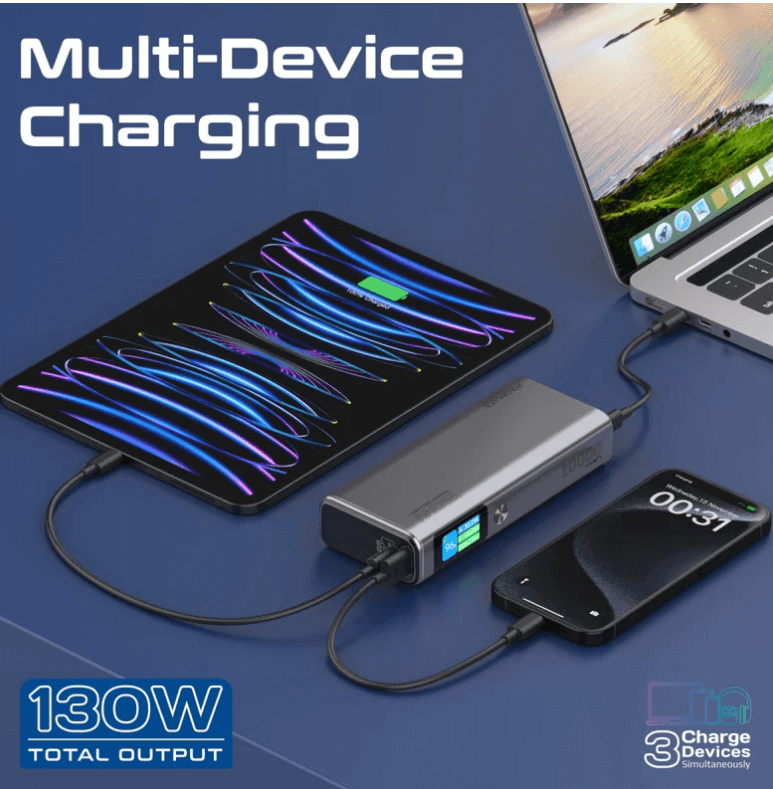 - Advanced Charging Technology: Featuring dual USB-C PD 3.0 ports with 100W and 60W outputs, and a 30W USB-A Quick Charge 3.0 port, the 130W Power Bank delivers lightning-fast charging powerbank for laptop, smartphones, tablets, and more. Charge up to three devices simultaneously with a total output of 130W.